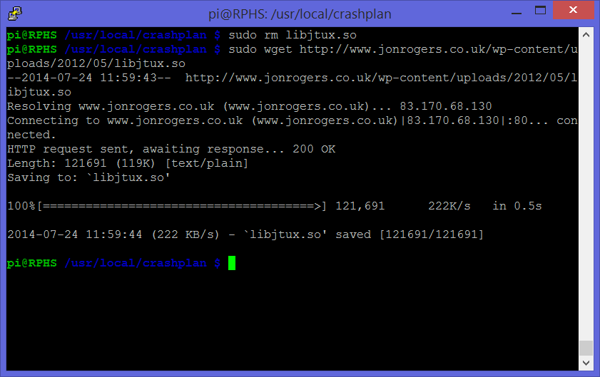 cd /usr/local/crashplan sudo rm libjtux.so sudo wget http://www.jonrogers.co.uk/wp-content/uploads/2012/05/libjtux.so