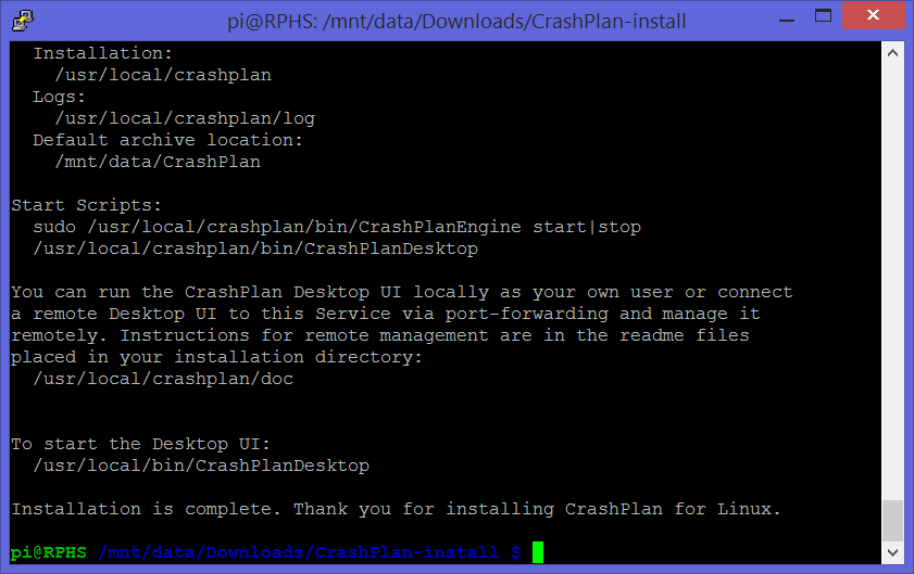 Some users have reported being able to get the engine running, but not the UI, and others have said that even the engine isn’t working anymore. My own CrashPi stopped working as well, and I haven’t had a chance to see if I can find a way around it. Until further notice, I can’t really recommend running CrashPlan on the Raspberry Pi. I’m open to suggestions if anyone knows a way to get it running and keep it that way, but I haven’t found one myself yet. I am looking into it, though.