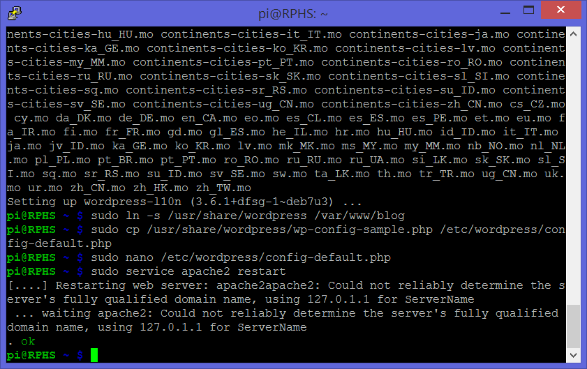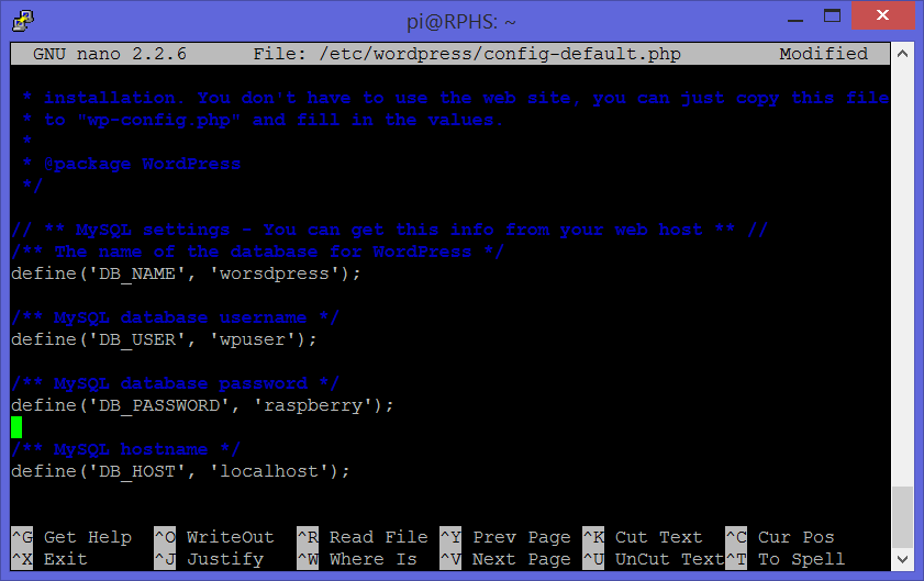 Way back in part 4 of this series, you installed a LAMP stack. If you recall, the “M” was for “MySQL”, and while we haven’t done anything with it yet, it’s been there, waiting for someone to put it to use. The WordPress blog engine is going to use MySQL to store all of the content for a blog. Get yourself logged in as “pi”, and enter the following commands at the command prompt, replacing the highlighted passwords with something of your choice.