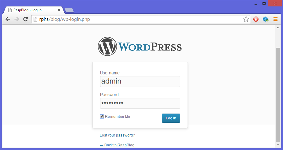 WordPress, being a web-based product, handles most of its configuration through its own web interface. Open a browser to your Raspberry Pi’s address, with an additional “/blog” on the end. That redirect you set up earlier will send the browser to WordPress, which will prompt for some initial values, and then complete its own installation.