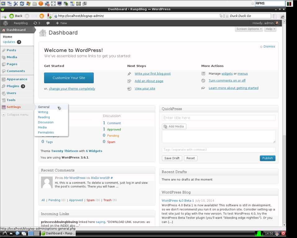 You’ll be taken to the WordPress Dashboard page. The care and feeding of a WordPress site is beyond the scope of this article, but I would like to point out one more thing that you’ll need to check. The addresses used by WordPress for things like links and style sheets are absolute addresses which include the name of the server. That server name might be set to “localhost” or an internal IP address right now.