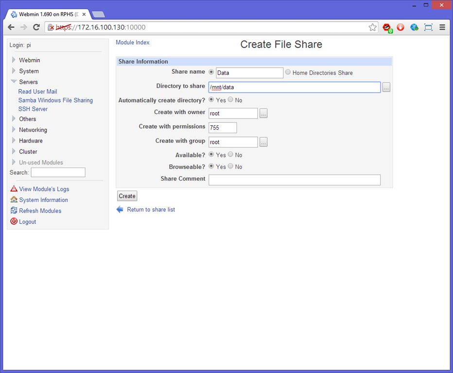 I’m not sure if you still monitor this page, but I’m having difficulties on setting up shares. I have setup my router to always set the pi’s ip address to 192.168.1.222. When I visit https://192.168.1.222:10000 from my main windows 7 pc, it says “This webpage is not available, ERR_CONNECTION_REFUSED”, or when trying to view it from the pi’s browser, it says “Oops! It was not possible to show this website”.