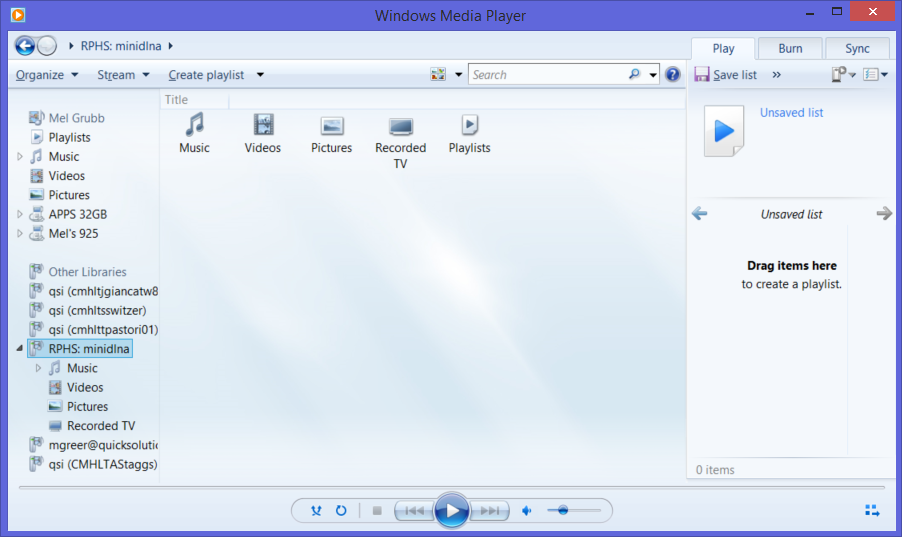 You should now be able to open something like Windows Media Player, and see an entry for “RPHS: minidlna” in the list on the left. Drilling down into this entry will show you the media that has been indexed so far.