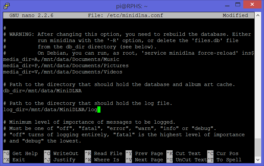 The letters A, P, and V indicate what kind of content each folder contains (audio, pictures, or video). Next, change the database and log folders to go to the data partition as well. This will conserve space on the relatively small OS partition. The lines to configure this are just below the media_dir lines modified above. Remove the pound signs, and change the folder paths: