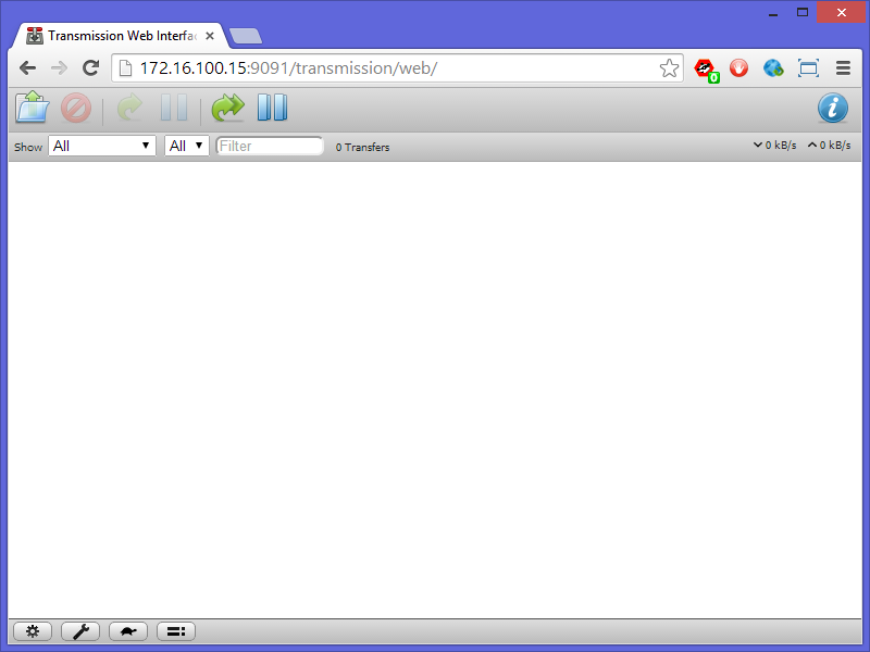 Transmission provides its own web interface, so there is nothing to add to Webmin. Open a browser and navigate to the Raspberry Pi, port 9091. You should see the Transmission interface, which is pretty basic.