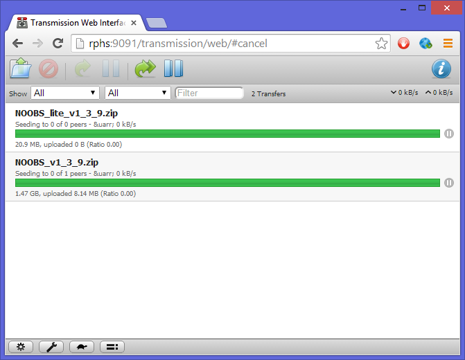 At this point, I’d like to suggest that you seed the archives for NOOBS and other Raspberry Pi images. Click on the open folder icon in the top left, enter the url of one of the torrent files, and click “Upload”.