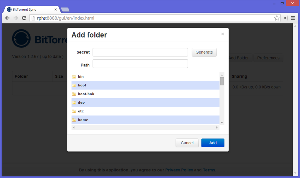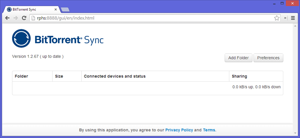 Open a browser to your Raspberry Pi’s IP address, port 8888.  This will bring you to BitTorrent Sync’s web interface. It doesn’t look like much, but that’s because you haven’t told it to sync anything yet.